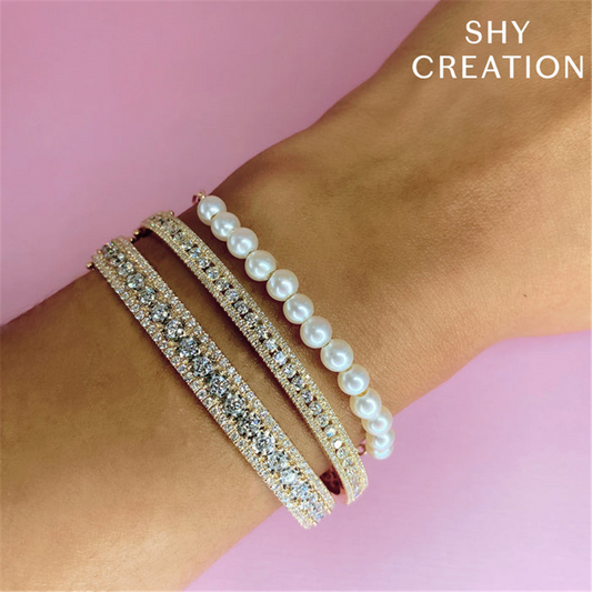 Shy Creation 14K Yellow and White Gold Alternating Pear Diamond and High-Polished Stone Bracelet