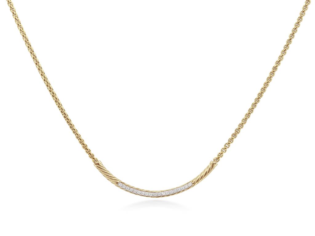 This necklace is crafted in 14k yellow gold and stainless steel and features a curved bar with 19 round diamonds totaling 0.16cts. Necklace length is 16.5".