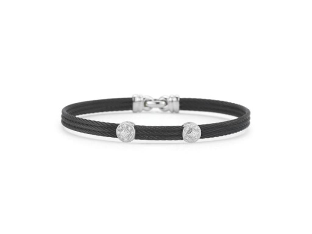 From the Alor Noir Collection, this bracelet features black PVD stainless steel cable with an 18k white gold double round station design accented with 0.09 carats of round brilliant cut white diamonds.
