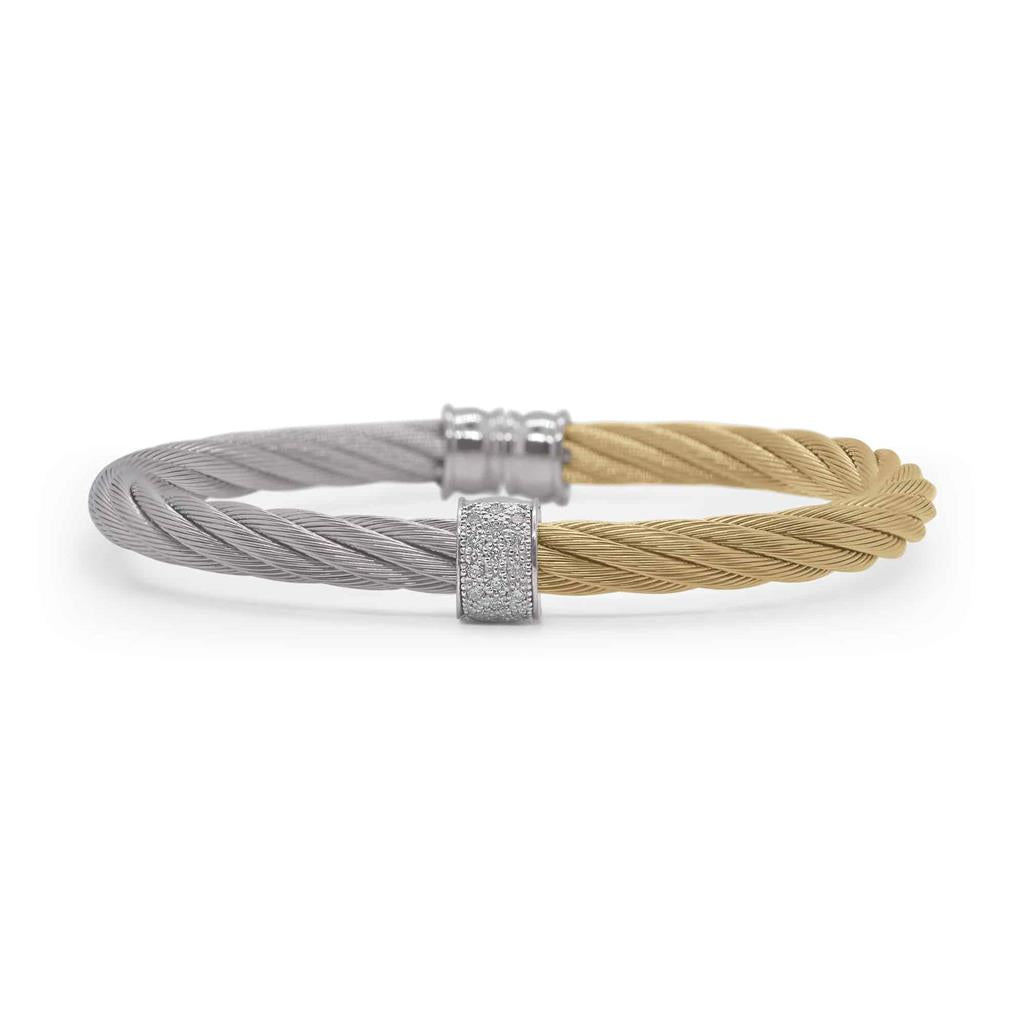 18K Gold and Stainless Steel, Two-Tone Grey & Yellow Cable Cuff Bacelet with Diamonds Station.