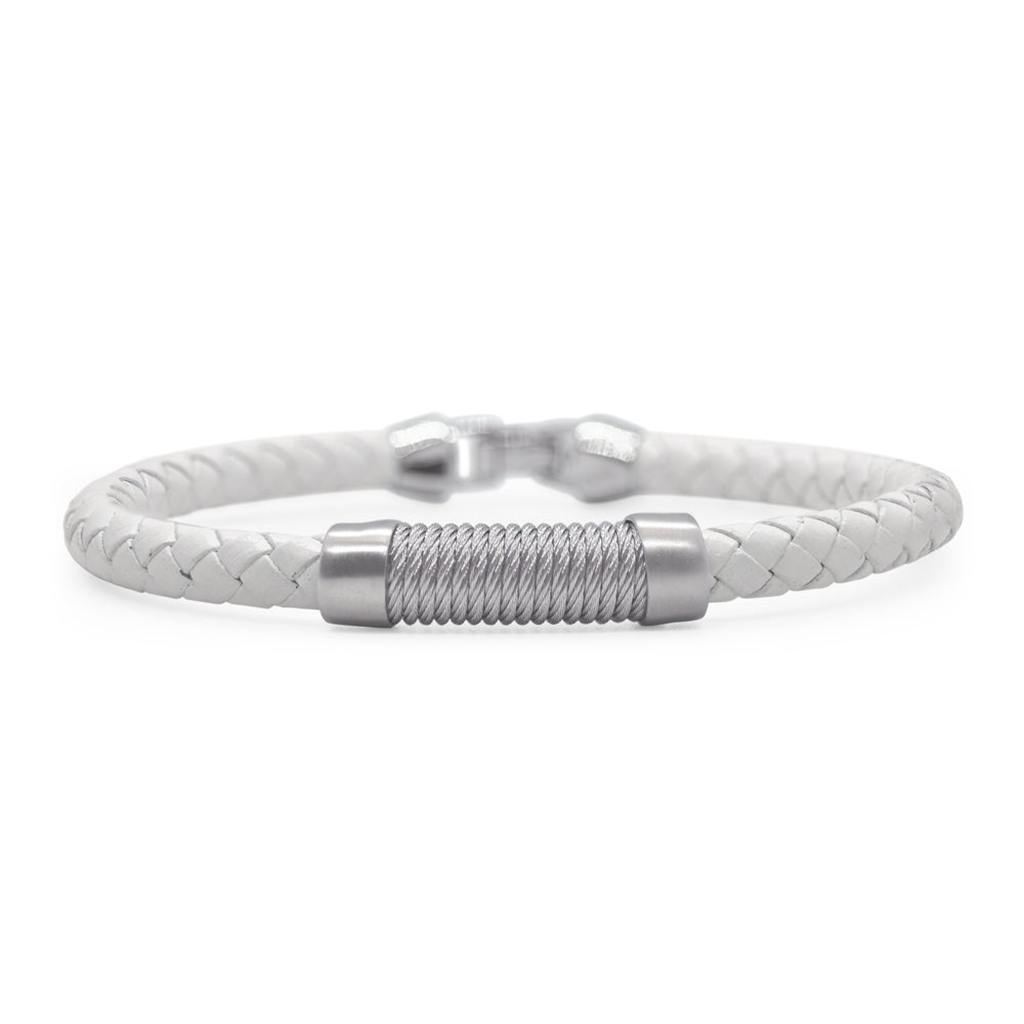 A braided white leather bracelet with a white twisted cable center station.