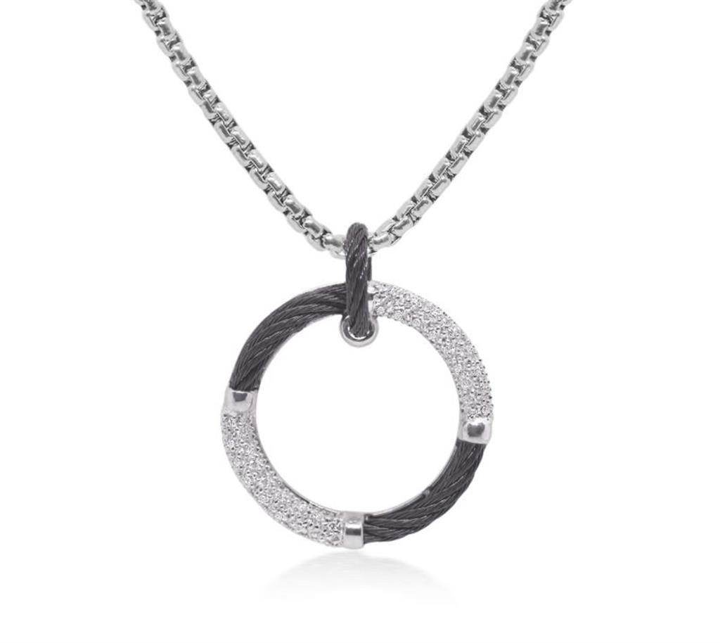 Alor Black Stainless Steel and 14K White Gold Diamond Alternating Pattern Circle Pend 0.16 Carats Adjustable 17.5 Inch Chain