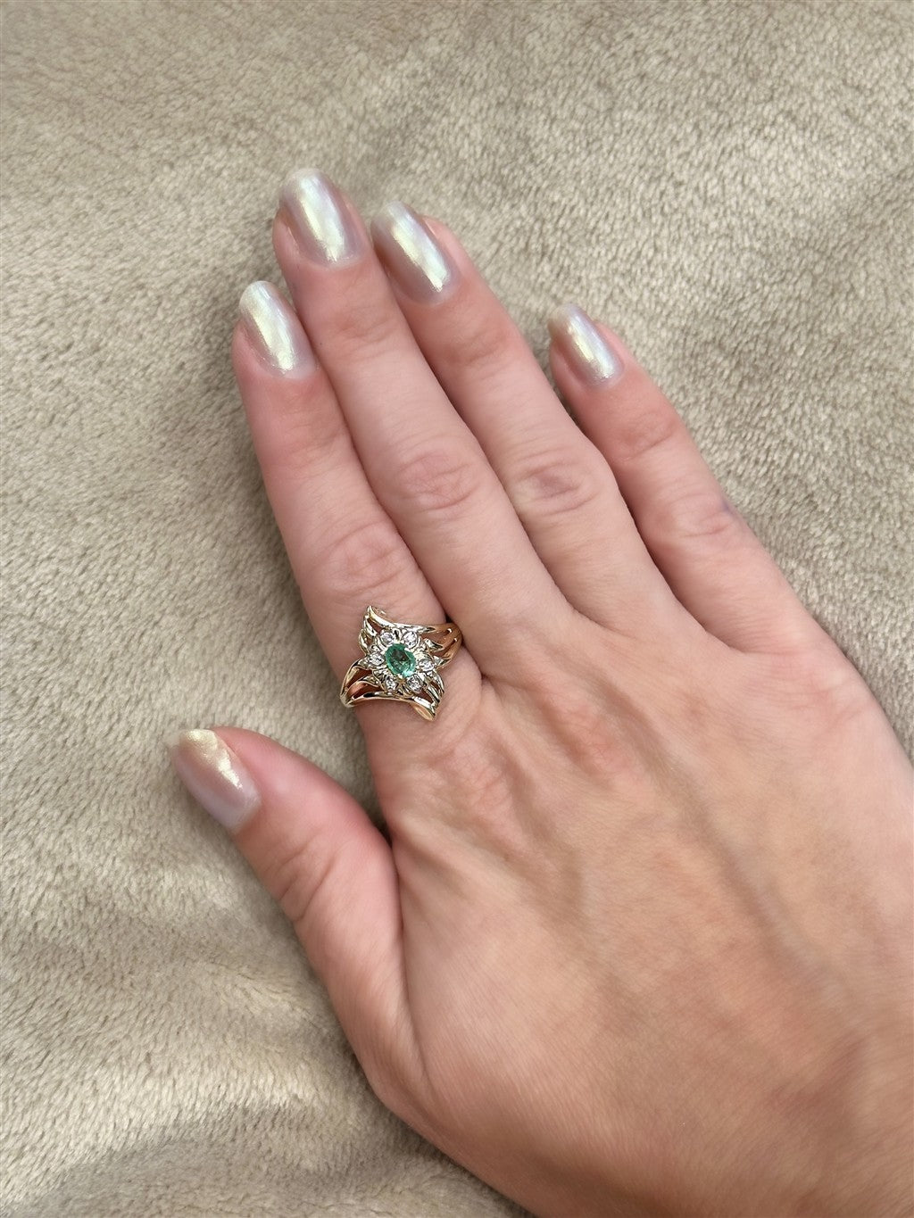 Estate 14K Yellow Gold Oval Emerald And Round Diamond Ring