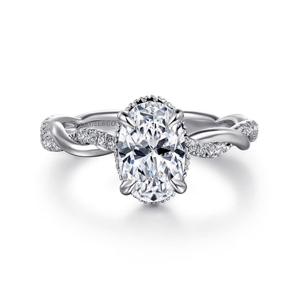 Delicate Strands Of Polished 14K White Gold And Bright Pavé Diamonds Intertwine Along The Shank Of This Charming Engagement Ring. The Twisted Band Showcases Your 1.5Ct Oval Cut Center Stone Which Is Nestled Within A Hidden Diamond Halo. Complete Your Proposal With This Beautiful 0.23Ct Diamond Ring.