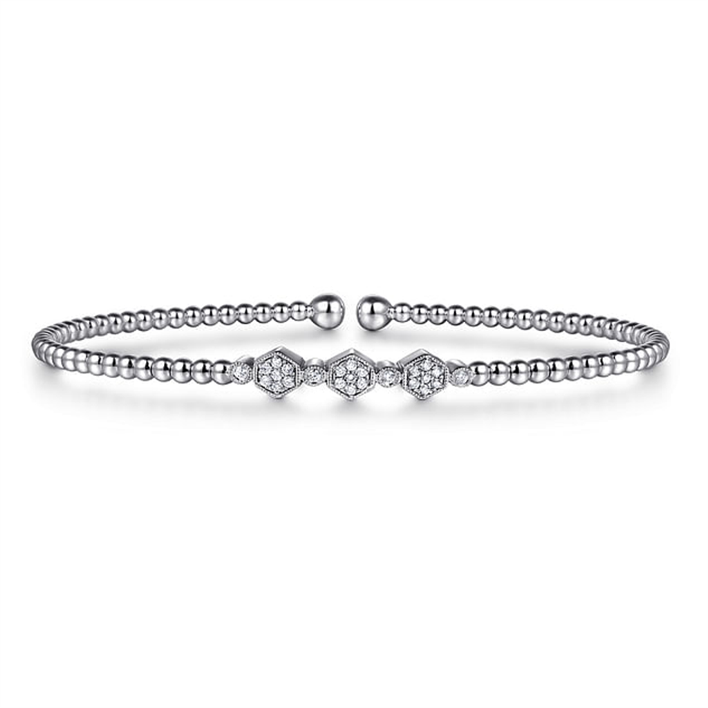 14K White Gold, Bujukan Bead & Diamond Hexagon Cluster Bangle Featuring 25 Round Diamonds Totaling 0.13Cts. Size is 6.25"