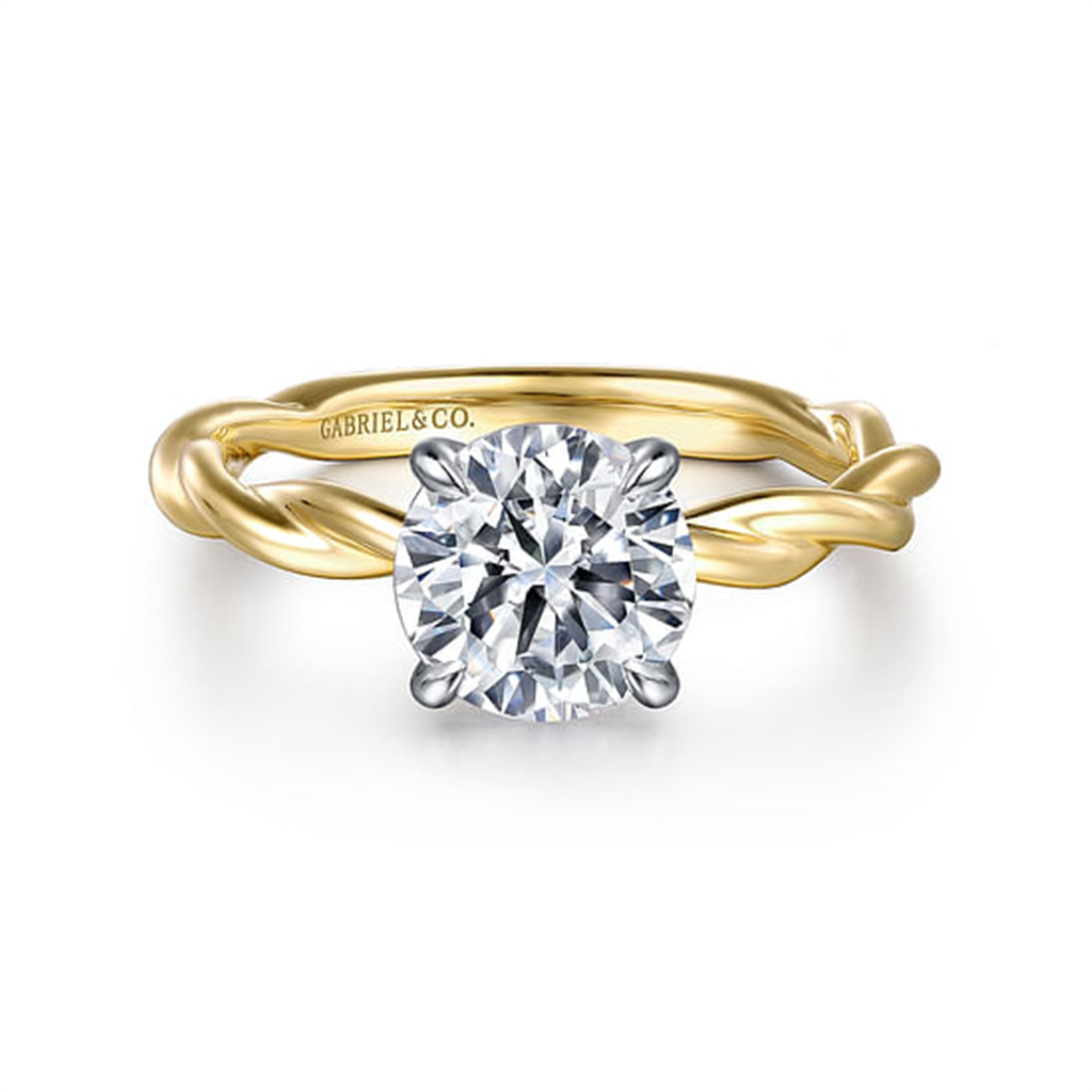 The 14K Yellow Gold Shank Of This Simple Yet Romantic Ring Features Two Strands Of Polished Metal Intertwining To Symbolize Two Lives Joining As One. Your 1.5Ct Round Center Stone Will Be Secure Within Four 14K White Gold Prongs.