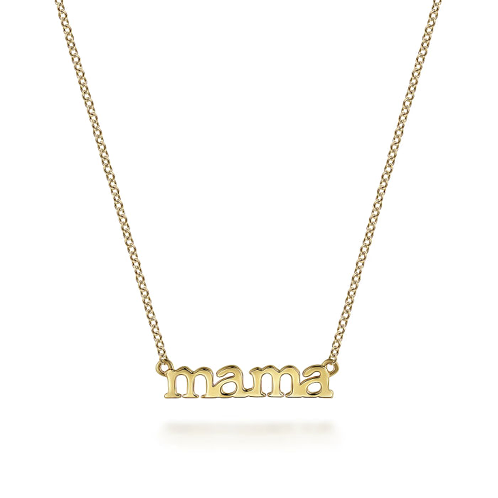 14K Yellow Gold "MAMA" Script Necklace. Chain length is 17.5".