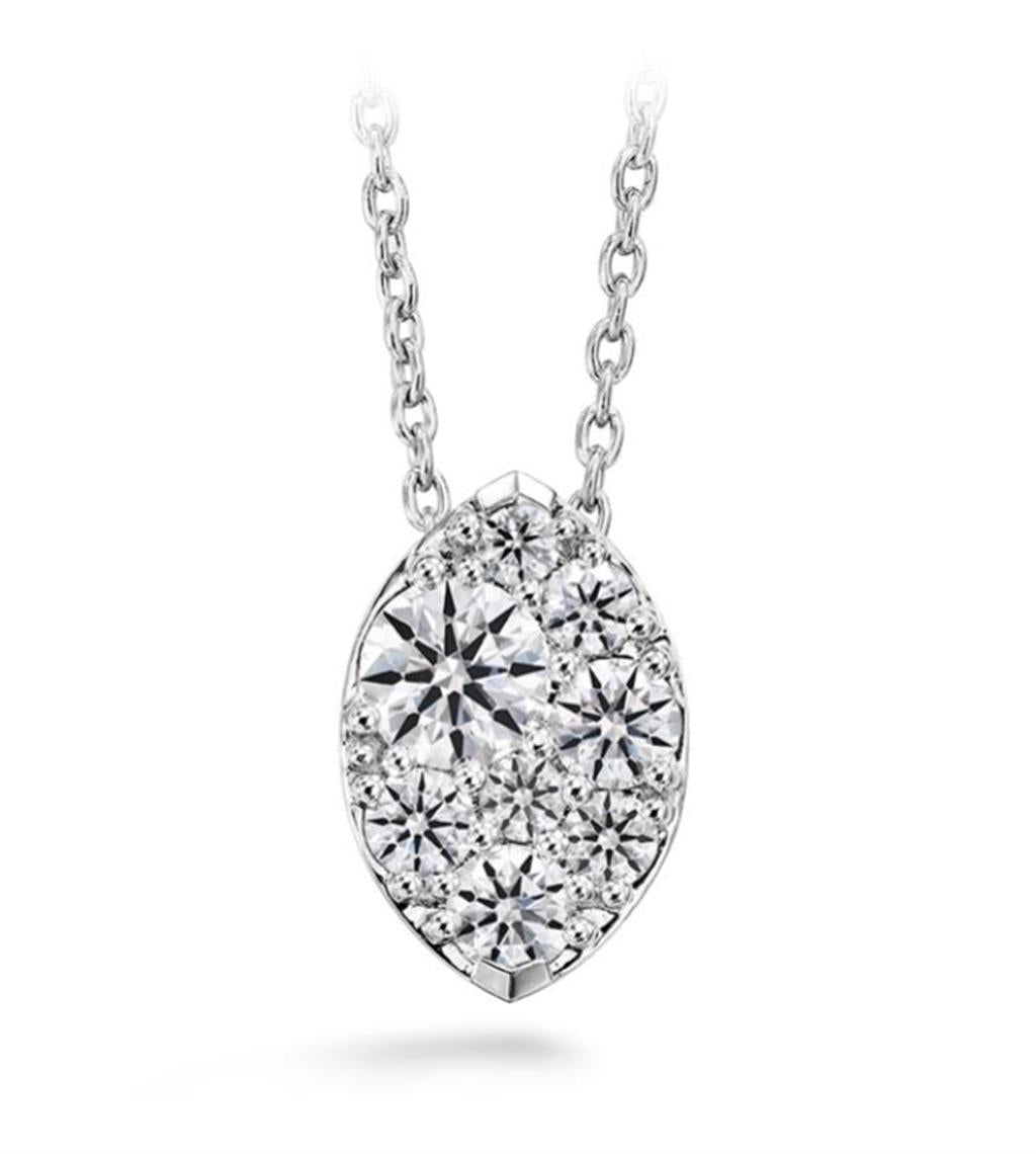 Navette is another term to describe a jewelry contour. Pointed at both ends with equally curved sides. Seamless, irregular pave to create a classic, but unique cluster look. Tapered from top to bottom to enhance the appearance of pure sparkle from the top view and help the pendant lay flush against the skin. Beautifully honey-combed back plating, mirrored inside and out for more luxurious finishing details.