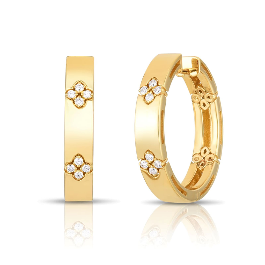 18K White Gold and features a floral design accented with .12 carats of round White Diamonds. Hoops are 24mm