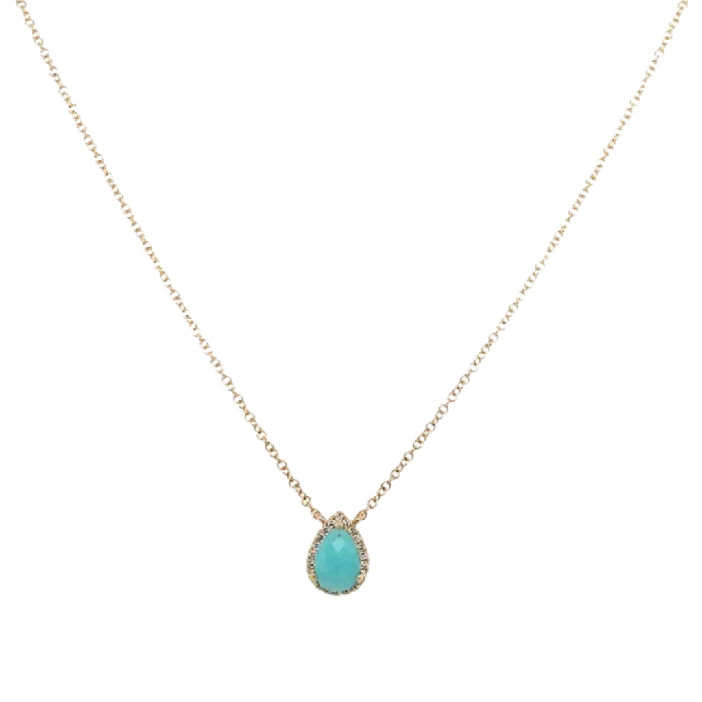 14k Yellow Gold Pear Shape Amazonite & Diamond Halo Pendant Necklace.