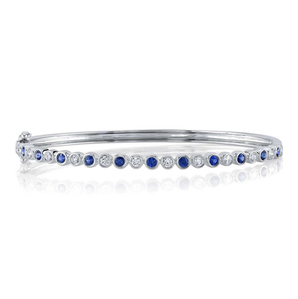 14K White Gold Shy Creation Bezel Set Blue Sapphire and Diamond Bangle Bracelet.
