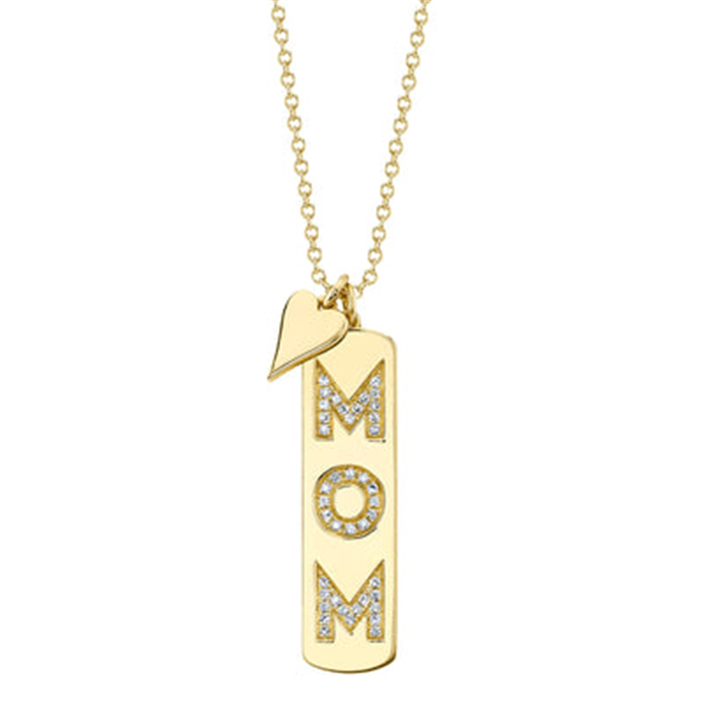 14k Yellow Gold Diamond Bar "MOM" Pendant Necklace with Adjustable Chain.