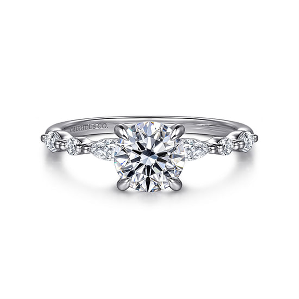 Embark On A Poetic Journey Of Love With Our 14K White Gold Round Diamond Engagement Ring. Crafted In Sumptuous 14K White Gold, This Engagement Ring Is A Wearable Sonnet. The 1 Ct Round-Cut Diamond, Nestled In A 0.30Ct Diamond Straight Band, Captivates With Its Brilliance—A Radiant Testament To Enduring Commitment. Two East-West Marquise Stones Flank The Center, Adding A Touch Of Regal Charm To This Classic Masterpiece.